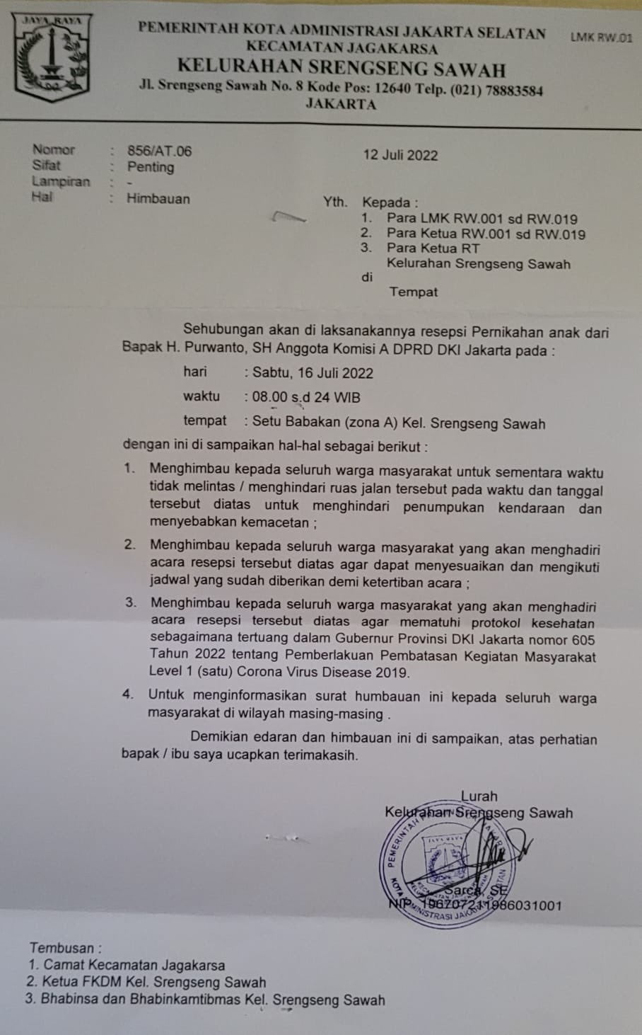ABATANEWS, JAKARTA — Surat edaran yang dikeluarkan oleh Kelurahan Srengseng Sawah, Jakarta Selatan, Jakarta, jadi perbincangan di platform media sosial.