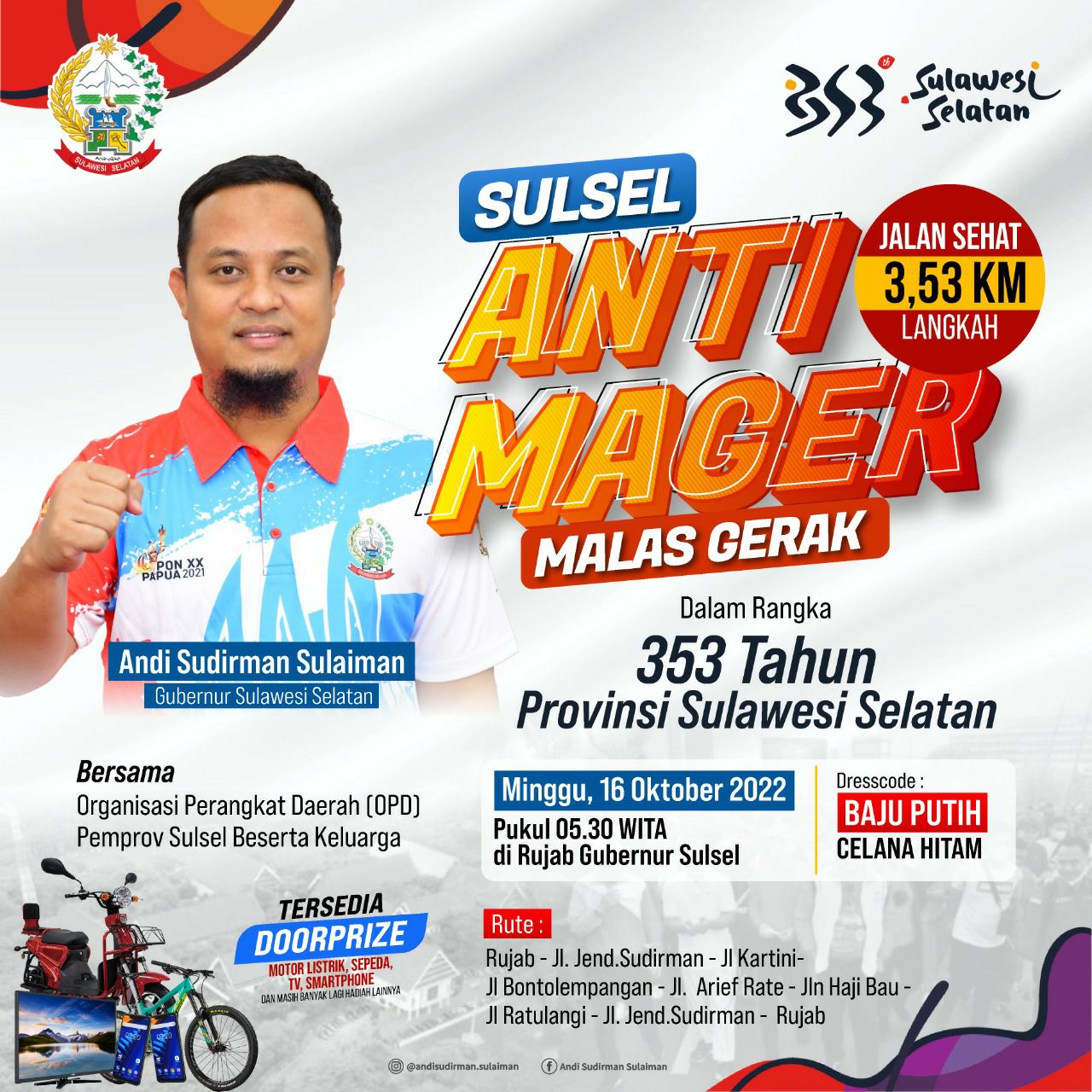 Gubernur Sulsel Andi Sudirman Sulaiman bersama warga Sulsel khususnya ASN dan keluarganya akan jalan sehat Anti Mager bersama sepanjang 3,53 kilometer. Jarak ini Sesuai dengan usia provinsi Sulsel yang jatuh pada 19 Oktober ini 353 tahun.