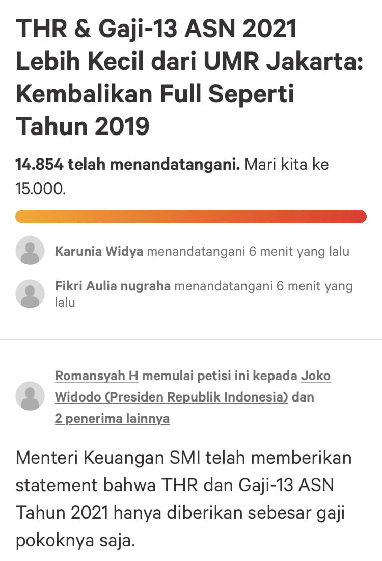Seperti dilihat di laman Change.org, petisi berjudul “THR & Gaji-13 ASN 2021 Lebih Kecil dari UMR Jakarta: Kembalikan Full Seperti Tahun 2019” diinisasi oleh seseorang bernama Romansyah H