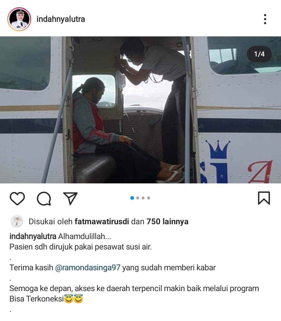 “Alhamdulillah, pasien sudah dirujuk pakai pesawat Susi Air, terima kasih @rampndasinga97 yang sudah memberi kabar. Semoga ke depan akses ke daerah terpencil makin baik, melalui program Bisa Terkoneksi,” tulis Indah di akun instagramnya.