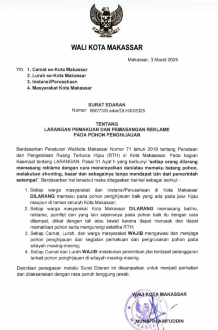 ABATANEWS, MAKASSAR – Pemerintah Kota (Pemkot) Makassar, mengeluarkan surat edaran Nomor: 660/73/S.edar/III/DLH/2025. Tentang larangan pemakuan dan pemasangan reklame pada pohon penghijauan.