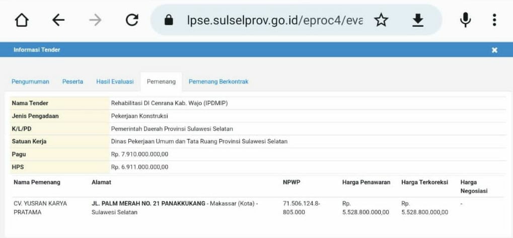 Berdasarkan data yang dipublikasi LPSE Sulsel, perusahaan bernama CV Yusran Karya Pratama dipercayakan untuk mengerjakan proyek Rehabilitasi di Cenrana Kabupaten Wajo, dengan pagu senilai Rp7,9 miliar, yang berada di bawah naungan Dinas Pekerjaan Umum dan Tata Ruang Provinsi Sulawesi Selatan.