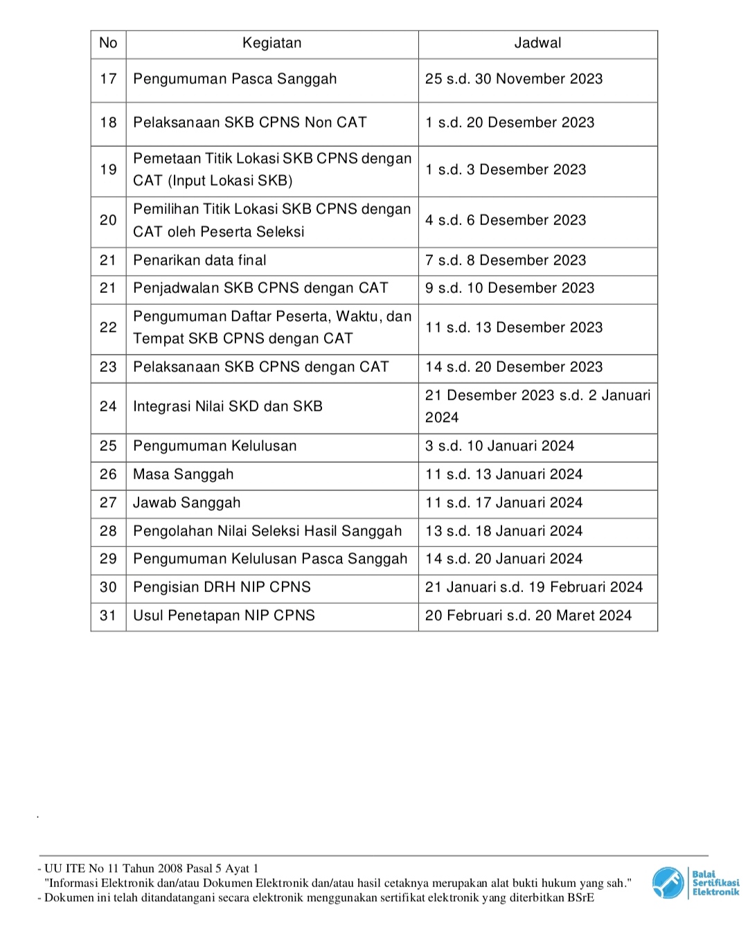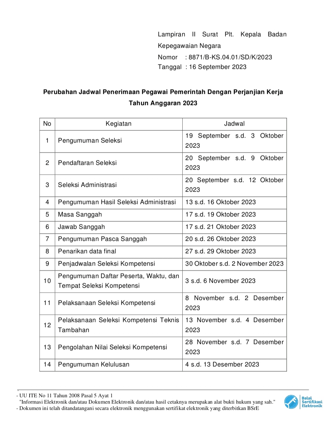 Olehnya, BKN mengeluarkan jadwal tahapan terbaru seleksi CASN 2023 yang mengatur tentang seleksi PNS dan PPPK.