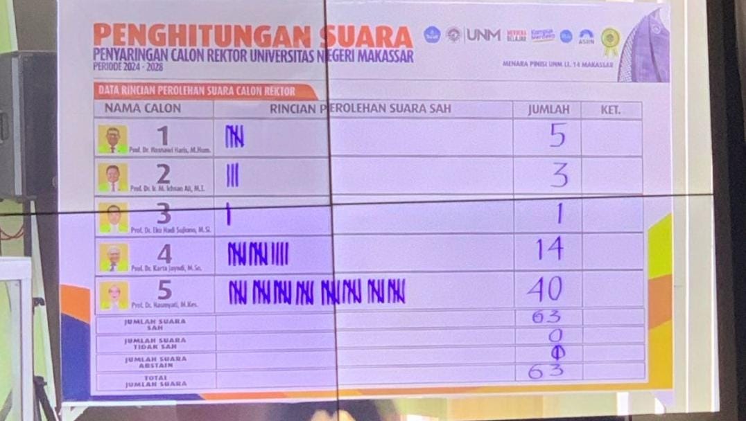 Hasilnya pun tak berbeda jauh. Pada pemilihan saat itu, Prof Hasmyati unggul dengan raihan 51 suara. Lalu Prof Karta Jayadi memperoleh 5 suara, disusul Prof Hasnawi dengan 4 suara. Sedangkan Prof Ichsan mendapat 3 suara dan Prof Eko tetap meraih 1 suara.