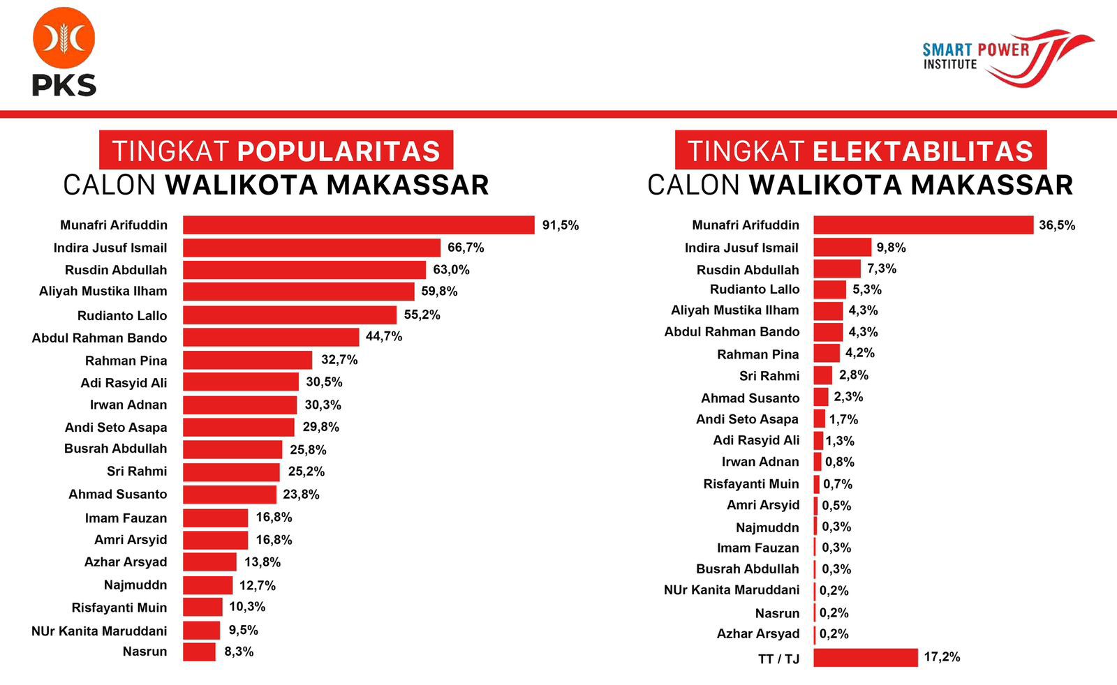 ABATANEWS, MAKASSAR — Survei internal PKS untuk Pilwalkot Makassar 2024 beredar. Dalam salah satu potongan data yang tersebar, tercantum nama lembaga Smart Power Institute.