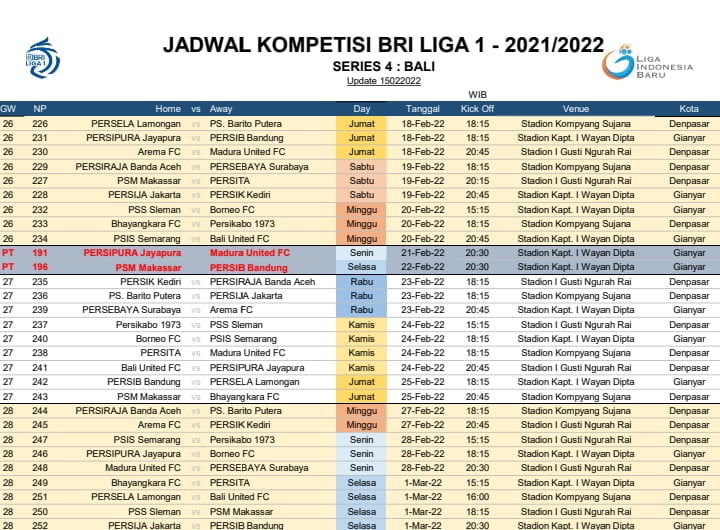 ABATANEWS, MAKASSAR – PT Liga Indonesia Baru (LIB) resmi mengeluarkan jadwal baru antara PSM Makassar versus Persib Bandung. Kedua kesebelasan bakal bertanding pada pekan depan.